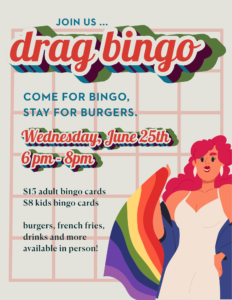 They’ll also be serving up house-made special burgers, hot off the grill and made with love (and a little sass). Whether you’re here for the bingo, the burgers, or just to soak up the good vibes, there’s a seat at the table for everyone.